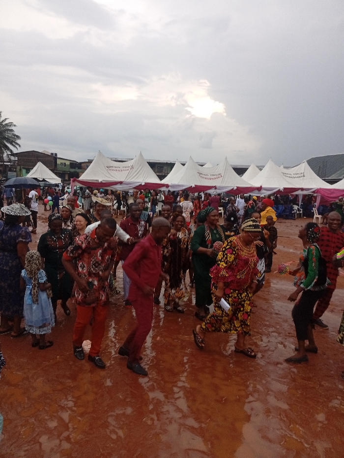 The scene depicts a large outdoor gathering in Akpaka Forest Reser, Nigeria, under an overcast sky with dense grey clouds, and a patch of brighter light visible through the cloud cover. The ground is reddish-brown, unpaved, visibly muddy, and wet with numerous puddles, indicating recent rainfall. In the midground, a line of approximately seven white, pyramidal event tents is erected. Each tent features decorative red or maroon fabric draping along its base. White plastic chairs are discernible beneath the tents. Buildings of varying heights, appearing to be residential or commercial structures, are visible in the background, along with some dark green foliage, including palm trees on the far left. A crowd of numerous individuals, including adults and children, occupies the foreground and midground. Attendees are dressed in a mix of formal and traditional African attire, characterized by vibrant, patterned fabrics, such as a man in a red patterned shirt and trousers, a woman in a yellow, red, and black patterned dress, and another man in a monochromatic deep red suit. Many women wear head coverings or hats. Footwear includes dress shoes and sandals, many of which appear soiled by mud. Numerous individuals in the foreground are actively dancing or moving rhythmically on the muddy surface, while others are standing, conversing, or observing. A young girl in a light blue dress and patterned headscarf stands on the left. A person in the far left background holds an open black umbrella. Many participants display smiles and appear engaged in the event.