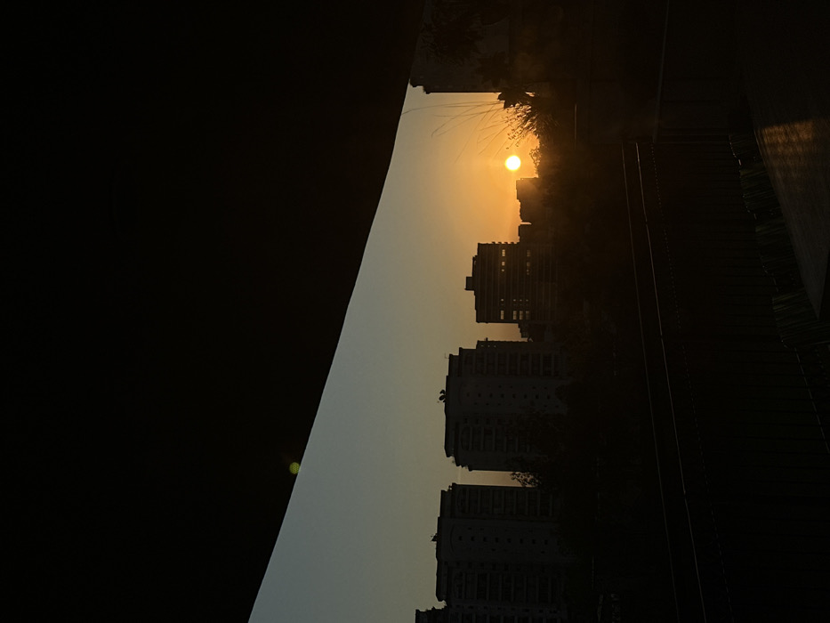 The image captures an urban landscape in Mexico City, Mexico, during either sunrise or sunset. The top and bottom of the frame are obscured by dark, silhouetted structural elements, suggesting a view from beneath an overhang or balcony, with a metal railing visible in the lower-center. The sky displays a gradient, transitioning from a dark blue-grey in the upper portion to a bright orange-yellow near the horizon. A prominent, intensely bright yellow-orange sun disc is positioned low on the horizon in the right-center, partially obscured by distant buildings and vegetation. Several multi-story buildings, dark and silhouetted against the bright sky, dominate the midground, interspersed with dark, indistinct trees and shrubs. A faint, circular green lens flare is visible in the upper-left sky section. No individuals, explicit actions, or interactions are present.