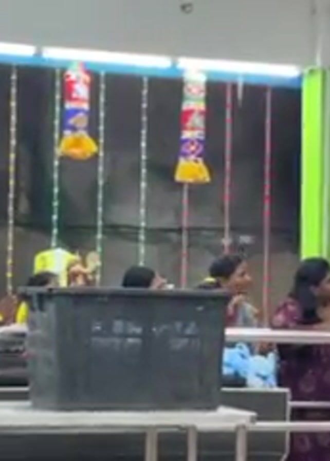 People gather at a Hindu temple, standing behind a metal railing