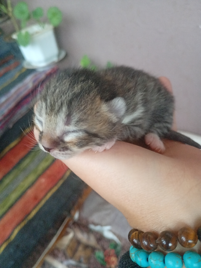- "A newborn kitten, exhibiting a tabby fur pattern primarily in brown and grey tones with hints of orange, is observed resting on an individual's open palm" by FM-75hZp2, licensed under CC BY 4.0
