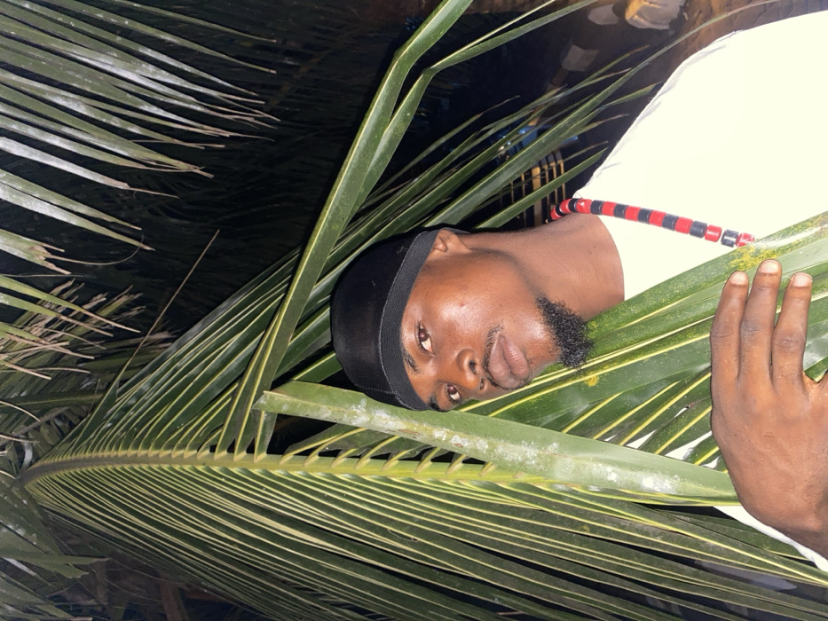 A man with dark skin lies horizontally, nestled among the leaves of a palm frond. He wears a black durag and a white shirt with a red and black striped beaded necklace. His beard is neatly trimmed. His hand rests on the leaves, slightly blurred. The background appears to be dark, suggesting nighttime.
