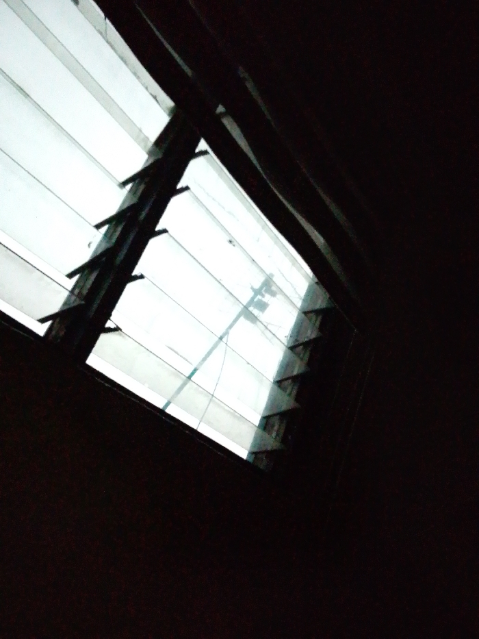 A low-angle shot peers through jalousie windows, their angled slats framing a view to the outside. An electrical pole stands tall against a bright, possibly overcast sky. The majority of the image is consumed by the room's darkness, contrasted by the light filtering through the slats. The composition emphasizes the contrast between the dark interior and the bright outdoor light.