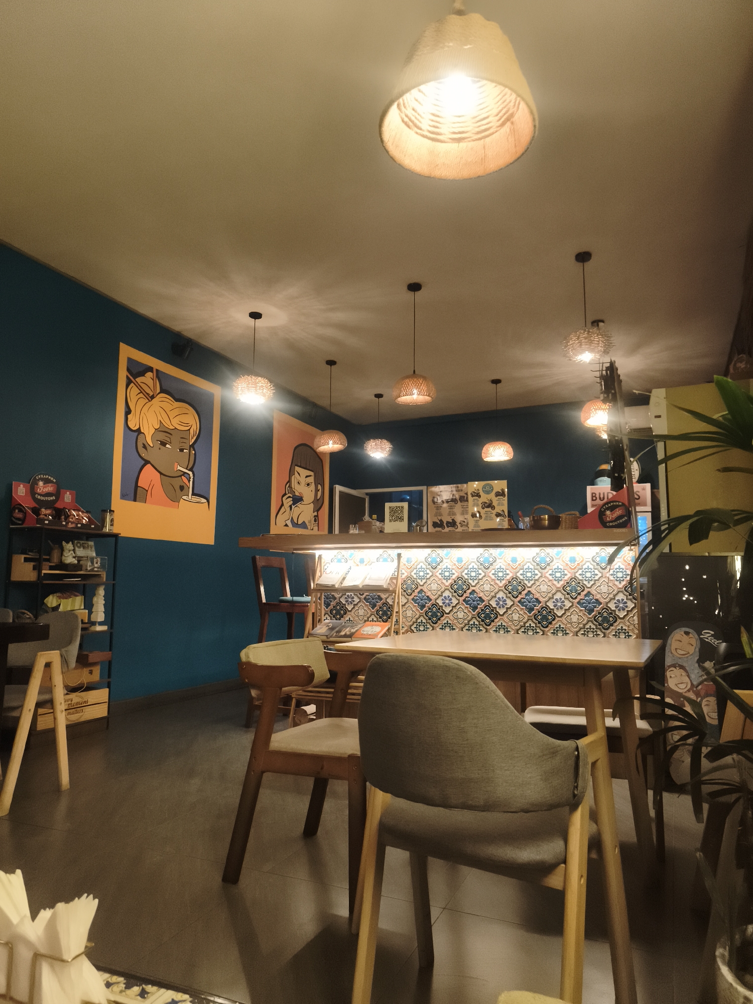 interior of a cafe or restaurant in Baan Bo Phut, Thailand. The space features a blue wall with framed illustrations of cartoonish figures. A high bar counter separates the seating area from the service area, with a pattern of colorful tiles decorating its front. Several woven pendant lights hang from the ceiling, illuminating the space. Tables and chairs are scattered throughout the room. Shelves display various items. The floor is tiled. A potted plant is visible in the foreground. There is no clear indication of people being in the scene.