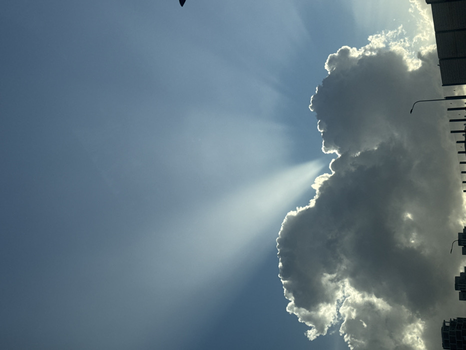 This image, captured in Hadera, Israel, depicts an outdoor scene predominantly featuring a blue sky with cloud formations and sunlight. A large, dark-grey cumulus cloud mass occupies the lower central and right portions of the frame. Bright sunlight, emanating from behind and within this cloud, creates distinct crepuscular rays that fan upwards into the lighter blue sky. The top and upper-right edges of the cloud are brightly illuminated, contrasting with its darker underbelly. No individuals are visible. Along the bottom edge of the frame, silhouetted elements of an urban environment are present, including multiple streetlights, partial outlines of buildings or structures on the left, and a long, solid barrier or wall extending from the mid-right.