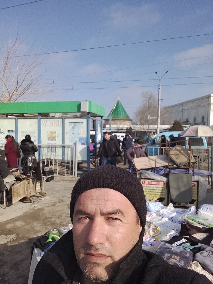 A man in a black beanie and jacket takes a selfie at an outdoor market. Behind him, people mill around stalls piled with goods. A green-roofed building is visible in the background, with a bus stop to the left and a light blue van to the right. The sky is a clear blue. The market appears crowded with a mix of shoppers and vendors.