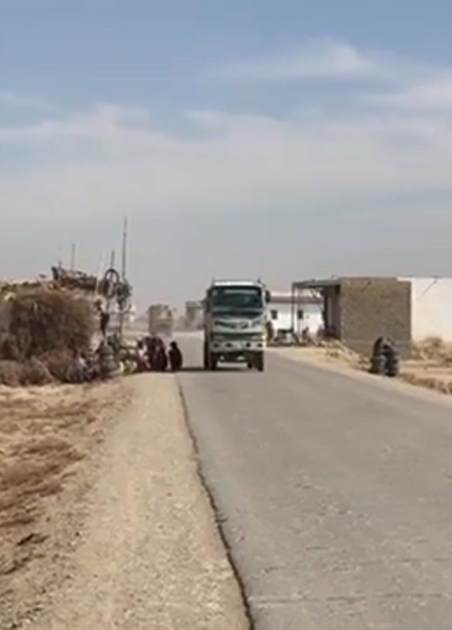 truck driving on a rural road. There are people sitting by the side of the road, next to some bundles of sticks. A white car is stopped on the side of the road, facing the same direction as the truck. The environment appears dry and dusty. There is a building on the right side of the road.