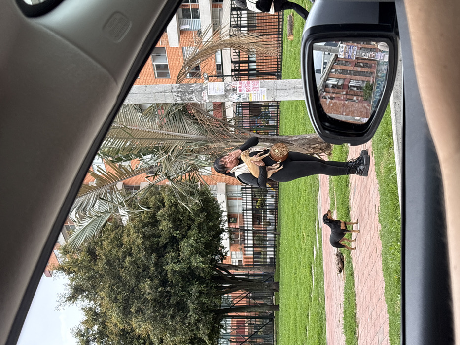 The image captures an urban outdoor scene in Bogota, Colombia, viewed from the interior of a vehicle. A female individual stands on a red brick pathway in the center-right, adjacent to a gray concrete utility pole. She is dressed in a black long-sleeved jumpsuit, a light-colored sleeveless vest, and black platform boots. She holds a small, light brown dog in her left arm and carries a leopard-print handbag over her left shoulder. Her right hand is raised to her face. To her left, a black and tan dog, resembling a Dachshund mix, stands on the pathway. A dark brown object, possibly wood debris, rests on the grass near the pathway. The immediate environment features a large expanse of green grass to the left, bordered by a black metal fence. Beyond the fence are multiple large, mature trees, including a palm tree. In the background, several multi-story red brick apartment buildings with numerous windows are visible. The concrete utility pole is covered with multiple white and yellow paper flyers, some displaying Spanish text pertaining to social security services (e.g., "AFILIESE A," "Salud y Pension," "ARL," "Caja de Compensacion") and prices in Colombian Pesos (e.g., "$80.000"). A second individual, dressed in dark clothing and carrying a light-colored bag, is partially visible walking away on the far right. The foreground shows the dark gray dashboard and a partial human arm from inside the vehicle, with a side-view mirror reflecting a brick building.