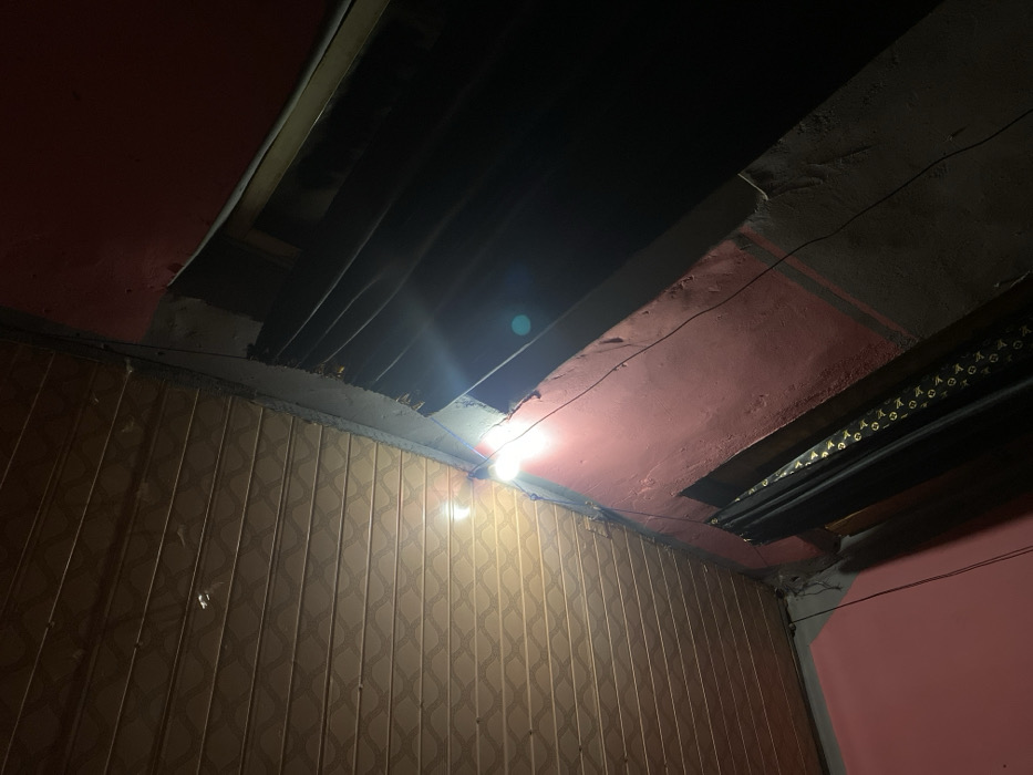 The image showcases an interior with damaged infrastructure. A portion of the ceiling is missing, revealing wooden beams above. The walls are lined with patterned plastic panels. A bare lightbulb hangs from wires, casting a harsh glow. The ceiling and upper walls are painted a shade of pink. Overall, the image depicts a state of disrepair and unfinished construction.