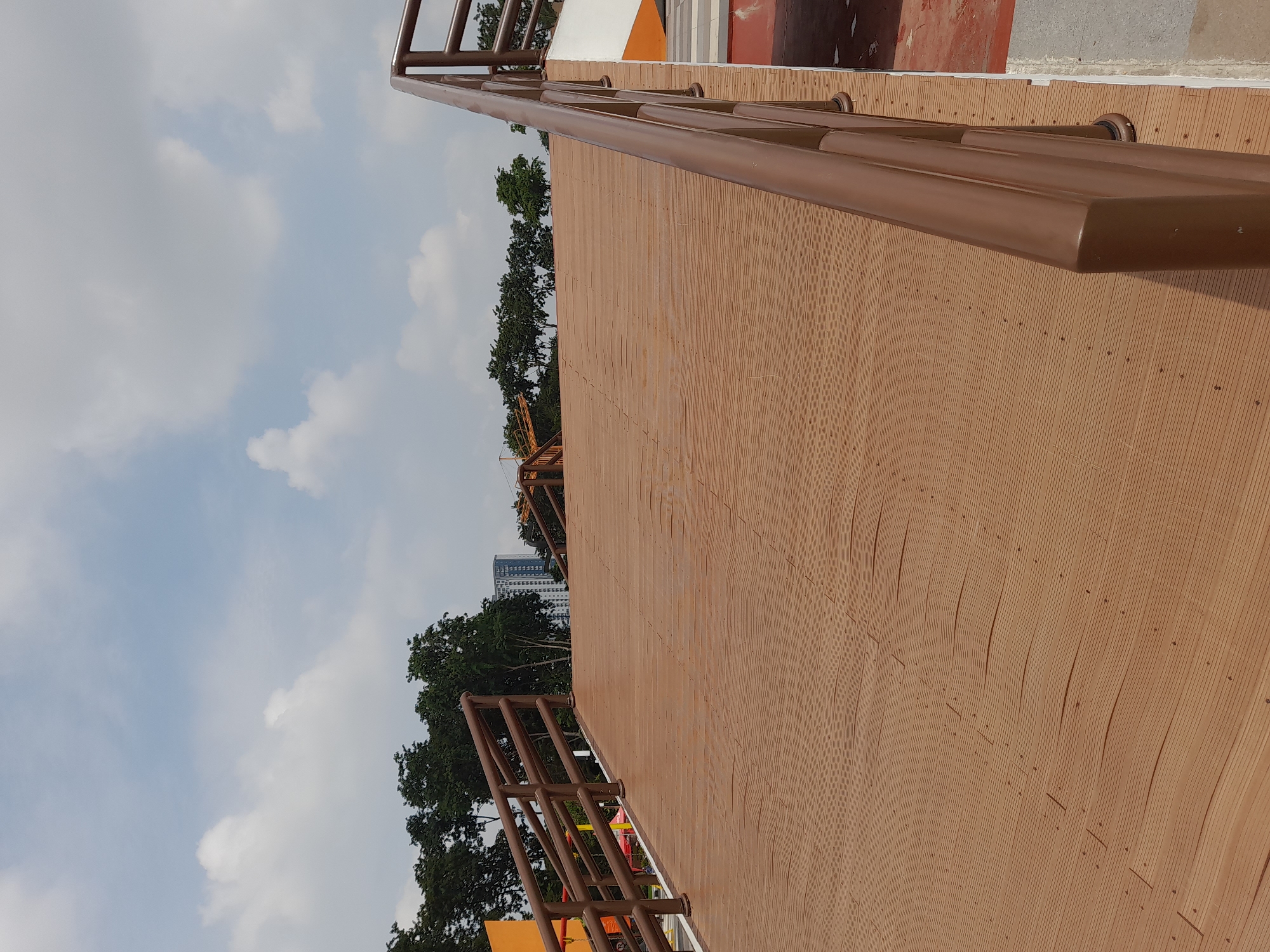 An outdoor pedestrian ramp, constructed from reddish-brown textured composite decking panels, ascends towards the horizon. Brown metal railings with multiple horizontal bars line both sides of the ramp. To the immediate left, a portion of an orange structure is visible, alongside green foliage. The right edge of the ramp meets a concrete surface. In the background, a line of dense green trees obscures the mid-ground, with a tall, light-colored multi-story building visible further in the distance against a partly cloudy sky. No individuals or active subjects are present. The scene is situated in Sidoarjo, Indonesia.