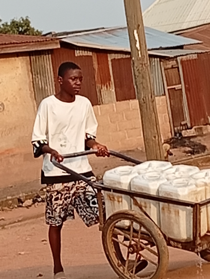 An outdoor scene in Gboko, Nigeria, depicts a young male pushing a two-wheeled handcart