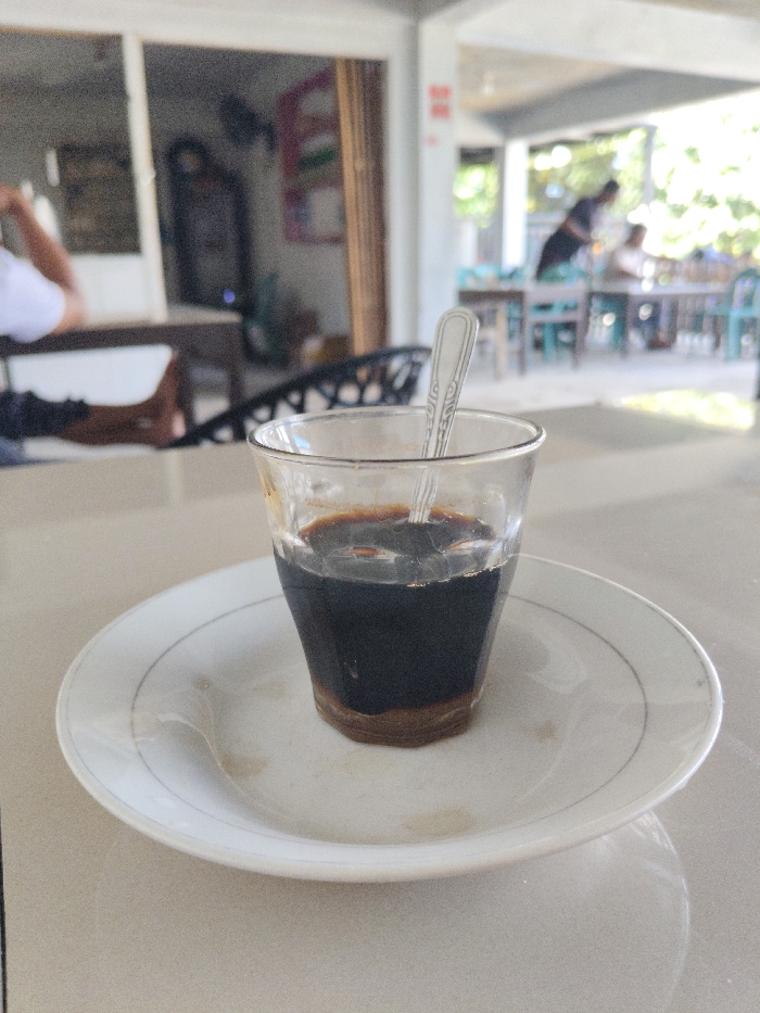 A glass of dark coffee rests on a white saucer with a silver spoon inside. The coffee is dark and appears to have some sediment at the bottom. The saucer has a thin, dark line around the rim. The foreground table is light-colored. Background shows a partially blurred cafe setting with tables, chairs, and people in the distance, suggesting an outdoor or semi-outdoor space. There is someone's arm at the corner of the image.