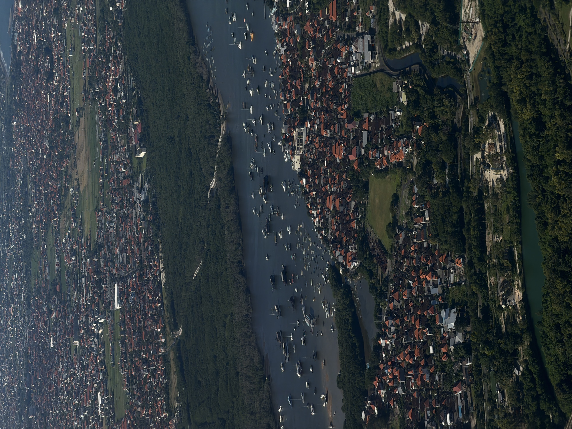 This aerial view captures a landscape with several key elements. On the left, a dense urban area is visible, characterized by a multitude of structures. A significant expanse of greenery, likely a forest or a large park, extends towards the center of the image. A body of water, possibly a river or a bay, runs between the urban area and the forest, with numerous boats scattered across its surface. On the right side of the body of water, there's another cluster of buildings, indicating a more dispersed residential area. The image portrays a coastal region combining urban development, natural environments, and maritime activity. This is in Denpasar, Indonesia.