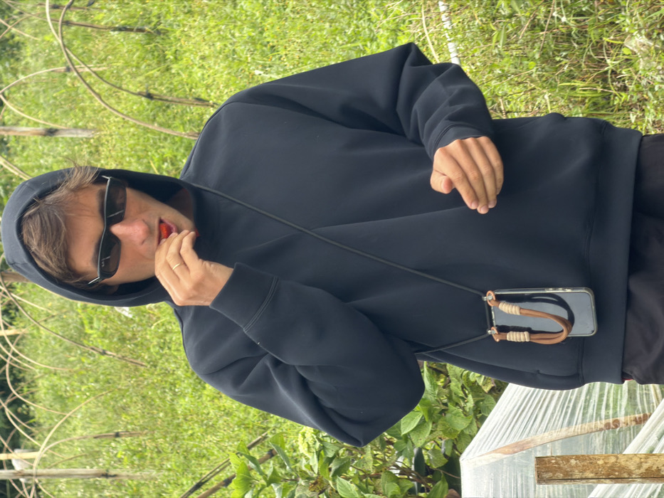 A person wearing a black hoodie and sunglasses stands outdoors with green foliage in the background. The person is eating a red fruit, possibly a strawberry, and has a phone case with a brown strap worn across their body. The photo appears to be taken from a slightly low angle.