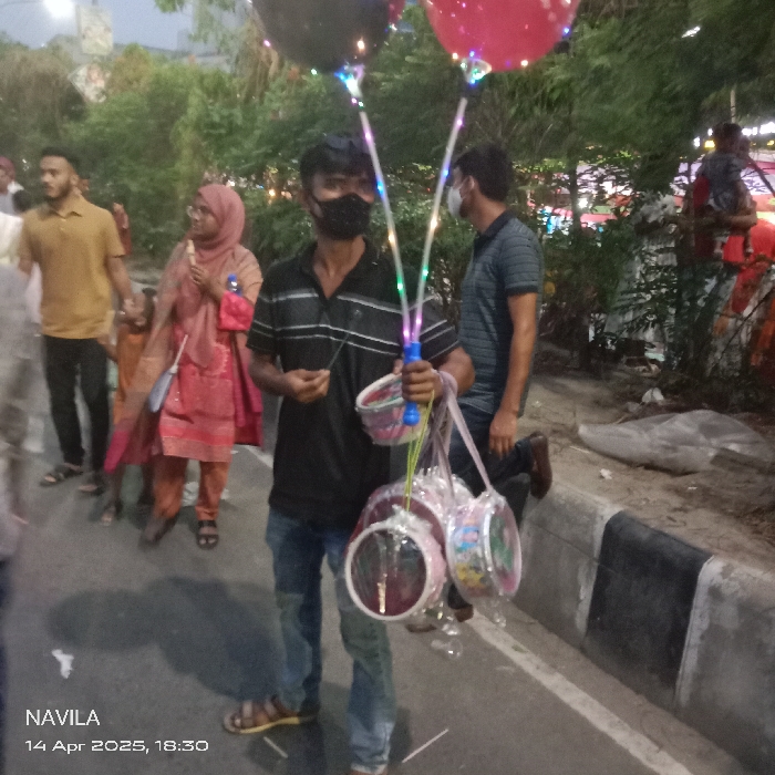 street scene in Dhaka, Bangladesh, captured at 23.779 latitude and 90.375 longitude. A young man, wearing a black and white striped t-shirt and blue jeans, is holding four small toy drums with colorful designs, wrapped in plastic bags. He is standing on a paved street. He is holding two light-up sticks with three balloons attached, one red and one black. A man in a blue shirt is standing to his right. A woman in a pink and white dress is standing to the left, with a girl in a black dress beside her. Two men are walking away in the background, and there is a lot of greenery in the background. The scene is lit by a streetlamp and the glow from the light-up sticks.