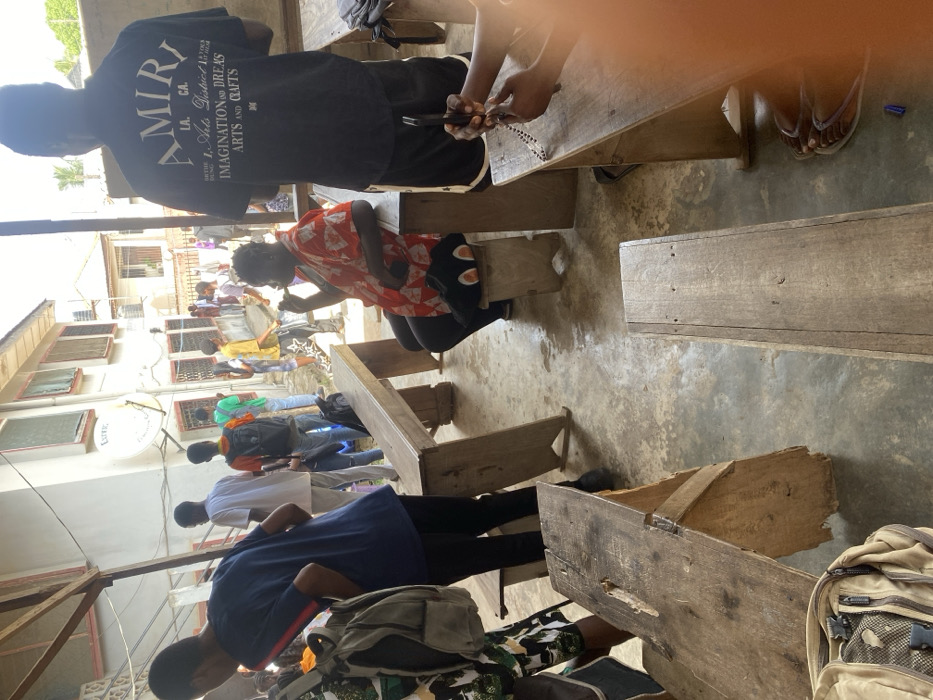 The image depicts an informal outdoor or semi-enclosed gathering area in Ibadan, Nigeria