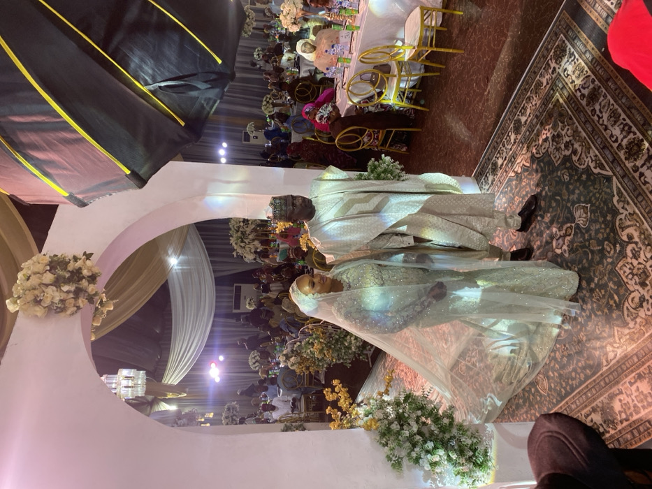 A bride and groom stand under a white arched doorway, adorned with white flowers, with wedding guests seated in the background. The bride wears a long, light-colored dress and veil. The groom is in a matching light-colored traditional attire. They stand on a patterned rug in a wedding reception hall. Tables are visible in the background, set for the celebration. The scene appears to be a wedding event.
