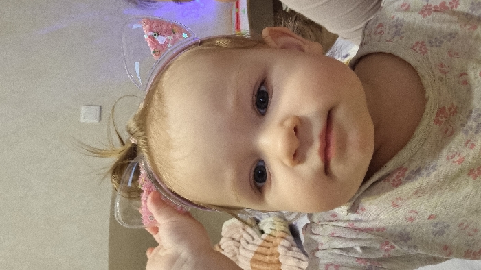 A young child with light hair and fair skin is wearing a cat-ear headband. The ears are translucent and pink, adorned with white stars. The child's eyes are blue, and they have a small, slightly upturned nose. They wear a long-sleeved garment with a floral pattern of pink and gray. The child is looking at the camera, with a slight smile. The background is a plain light-colored wall with a light switch.