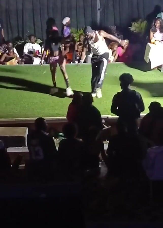Two performers dance on a stage covered with artificial turf, in front of an audience. The woman, wearing a black top and a patterned skirt, moves with energy. The man, in a white tank top and dark pants with white stripes, matches her pace. The audience sits in the dark, their silhouettes barely visible. A few people are seated at tables on the stage, watching the performance. The background consists of a dark curtain and a chain-link fence.