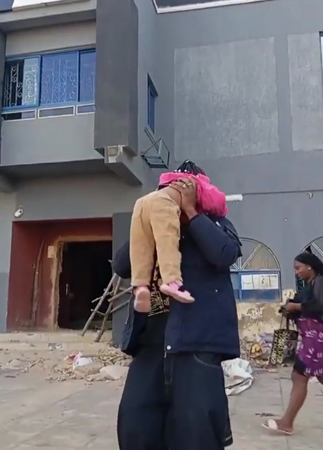 A man in a black T-shirt, black jacket, and blue jeans tosses a toddler in the air. The toddler is wearing a pink sweater and pink shoes, as well as a pink bow on its head. The man catches the child, hugs her, and then holds her on his hip. He looks at her as she looks forward. They are standing outside a gray building with a sign that says "City Hub." A woman walks behind them, carrying a bag. There are construction materials in the background.