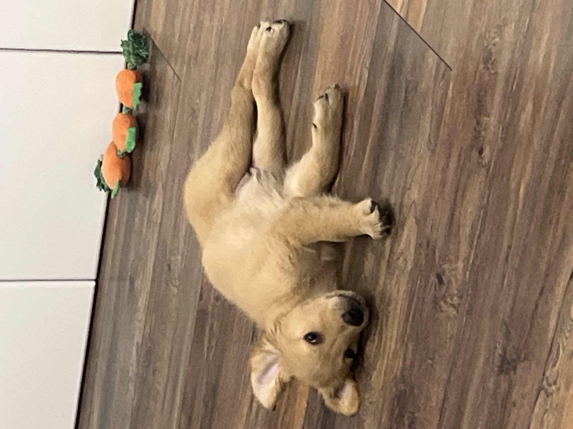 - "An interior scene depicts a light-colored golden retriever puppy lying on its left side on a dark wood-patterned floor" by FM-lpmjW2, licensed under CC BY 4.0