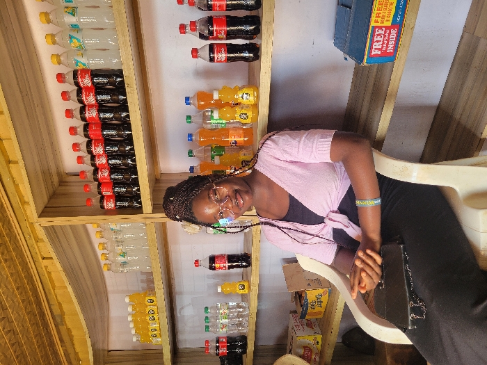 The scene is set indoors, likely within a small shop or retail establishment in Gura Top, Nigeria, characterized by a light-colored wooden slatted ceiling and white or light-colored walls. A young Black female is centrally positioned, seated in a cream-colored plastic chair, facing forward and smiling at the viewer. She wears a black tank top, a light pink short-sleeved cardigan tied at the waist, and a long black skirt or dress. Her hair is styled in dark braids, and she wears round, clear-rimmed glasses. A light blue and yellow wristband is visible on her left wrist. Her hands are clasped on her lap, resting on a small black purse or clutch with a silver chain strap. Behind the individual, a multi-tiered wooden shelving unit spans the width of the frame, stocked with various beverages and packaged goods. The top shelf displays numerous plastic bottles, including approximately 13 bottles of Coca-Cola, multiple bottles of clear liquid with clear, yellow, or light blue caps (likely water or clear soda), and a cluster of yellow-capped bottles containing a yellow liquid (likely a juice or soda). The middle shelf features an assortment of plastic bottles with dark liquid (Coca-Cola), orange liquid (orange soda), and clear liquid, along with several cardboard boxes. Notable labels include "BUTTER BLISS" on one box and a blue box partially visible on the right, stating "FREE 1 pack of sachets INSIDE." The bottom shelf is mostly obscured by the seated individual and the chair, but additional shelves are visible below, indicating further storage or display space.