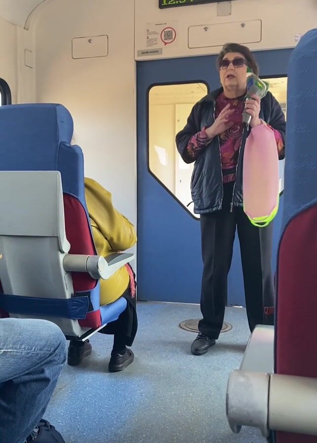 n older woman standing on a train, holding an object in her hands and gesturing with her free hand as if she is talking