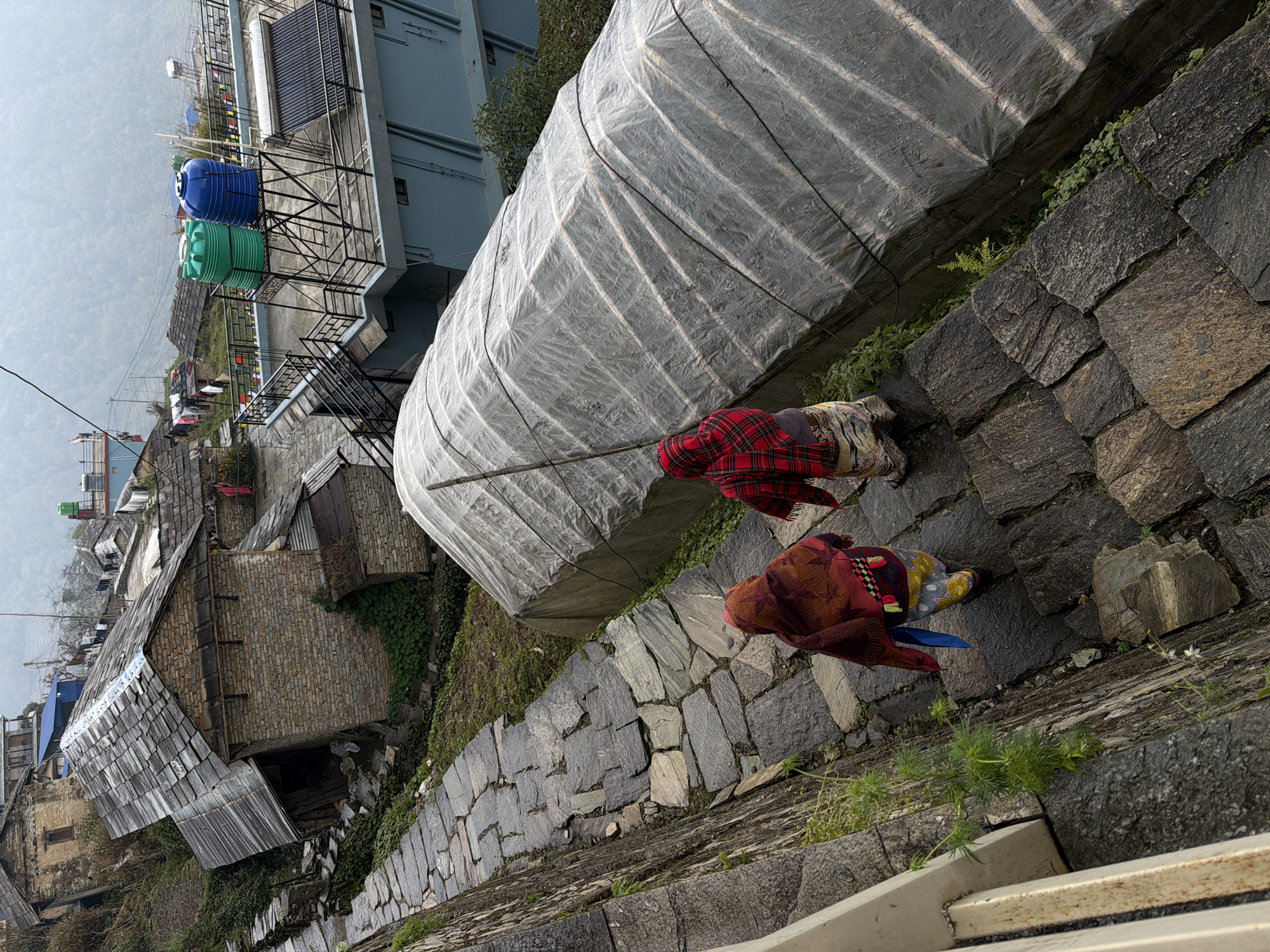 Two individuals descend a steep, irregular stone pathway in Purano Ghandruk, Nepal, under an overcast sky. The path consists of dark grey and brown flagstones and is bordered on the left by a stone retaining wall with a partial white/beige railing in the foreground. Vegetation grows along the path edges. The lead individual, closer to the viewer, wears a dark red and brown patterned shawl over patterned trousers with yellow, blue, and black motifs. A blue object is visible at their left hip. The second individual, slightly ahead and to the right, wears a red and black plaid shawl over a gray top and a light-colored, patterned skirt, carrying a long, thin wooden stick in their right hand. To the immediate right of the pathway, a long, tunnel-shaped structure covered with translucent, silvery-gray plastic sheeting with dark horizontal straps runs parallel to the path. Beyond this, a light blue multi-story building with a flat roof features a black metal railing, a green and a blue plastic water tank on metal stands, and a black solar water heater panel. Laundry hangs on lines further down the slope. To the left of the pathway, traditional stone buildings with dark, layered slate roofs are built into the terraced hillside. One prominent stone building has a visible wooden lean-to structure. The distant background shows hazy mountains.