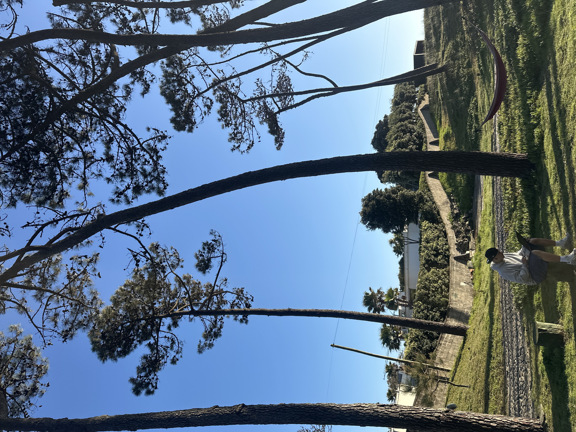 landscape scene in Esposende, Portugal. Trees frame a view of a clear, blue sky above and an embankment on the right side of the frame. A person wearing a light-colored sweatshirt and shorts, along with a baseball cap, sits on a grassy area near a stone pathway along the embankment. The embankment includes a stone wall. In the distance, there are buildings and palm trees. A suspended hammock hangs from a tree on the embankment. Powerlines are visible among the trees.