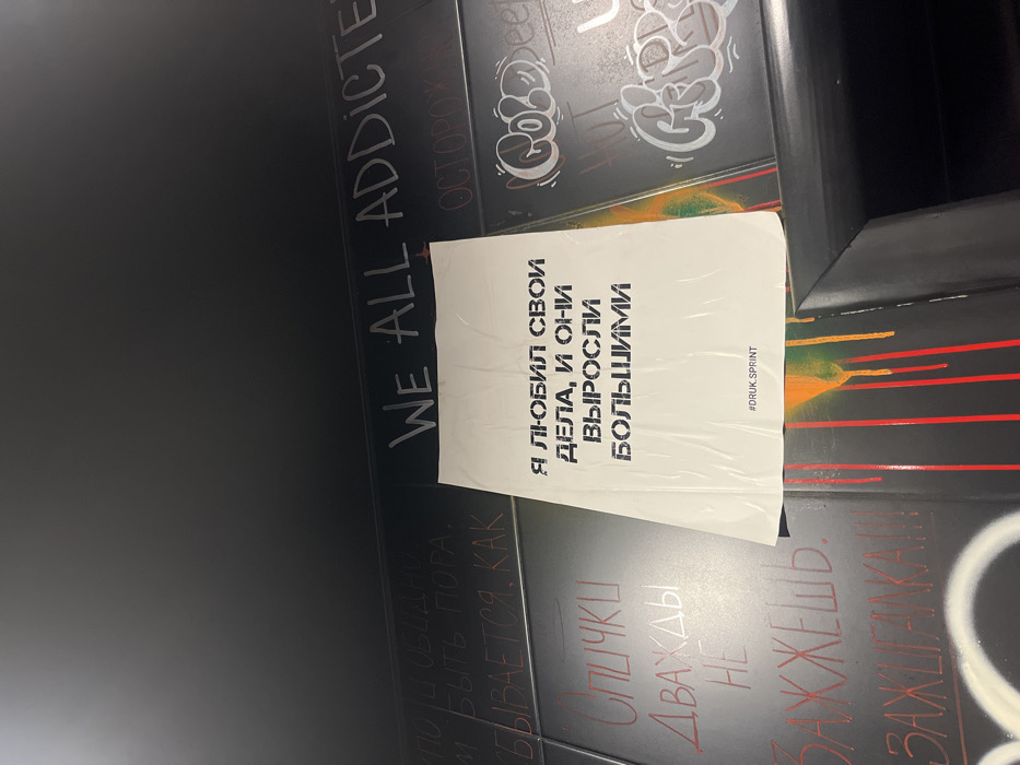 An upward-angled close-up shot depicts a segment of a dark, graffiti-covered interior wall located in Minsk, Belarus. The primary subject is a white, rectangular poster, slightly wrinkled, affixed vertically to the wall. The poster features black, bold Cyrillic text that translates to: "I loved my deeds, and they grew big." Below this, the hashtag "#DRUK.SPRINT" is visible. The dark wall is extensively marked with various handwritten texts and graffiti in white, red, and other faded colors. Prominent English text visible at the top right reads "WE ALL ADDICTED." Several Cyrillic phrases are also present: "СПИЧКИ ДВАЖДЫ НЕ ЗАЖЖЕШЬ!" (Matches cannot be lit twice!) in red, "ЗАЖИГАЛКА!!!" (Lighter!!!), and a partially visible "ОСТОРОЖНО" (Careful/Caution). The wall also displays stylized graffiti elements, including white bubble-like shapes and vertical streaks of red, orange, and green paint, suggesting drips. A dark architectural element, possibly a door frame or a corner, is visible on the lower right. No individuals are present in the image, and no specific actions or interactions are depicted. The scene is static under ambient lighting, with a slight glare at the very top of the frame.