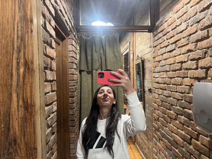 A woman in a white Adidas sweatshirt takes a selfie in a bathroom. The walls are brick on the right and wooden paneling on the left. A dark green curtain hangs in front of a mirror. A soap dispenser is on the right wall. The lighting is bright, with a window visible above the mirror. The bathroom has a rustic aesthetic.