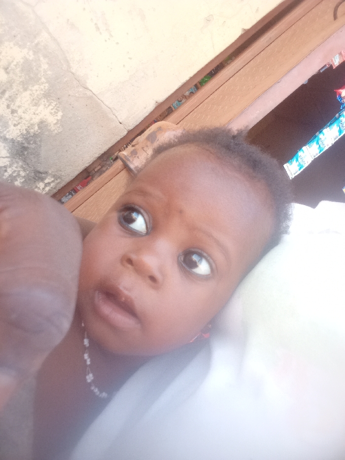 The image presents a close-up, slightly angled view of a young child's face. The child has dark skin, wide dark eyes looking upwards and to the right, and short, dark, curly hair. A delicate silver-colored necklace with small white elements is visible on the child's chest, and a small red earring is present in the right ear. Part of a white or light-colored garment is visible on the child's left side. A dark-skinned hand is partially visible on the far left, appearing to support or hold the child. The background on the upper left consists of a light-colored concrete or stucco wall with visible cracks and discoloration. Adjacent to the wall, a wooden structure, possibly a door or window frame, is present. Behind this wooden structure and extending to the upper right, a shadowed area reveals various small, colorful objects, including blue and white packaged items, suggesting a retail or residential environment where goods are stored or displayed. The lighting is bright, causing some overexposure on the child's right side and the white garment. The requested location in the city of Minna, Nigeria, cannot be visually confirmed from the content of this photograph.
