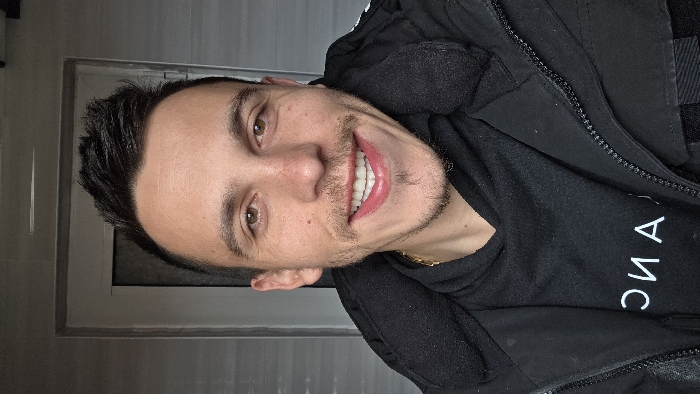 A single male individual, appearing to be an adult, is depicted in a close-up, headshot-style image. The subject possesses dark brown hair, styled with volume on top, and brown eyes. Light stubble is present on the cheeks and chin, with a more defined mustache and a small soul patch. Freckles are visible on the nose and adjacent cheek areas. The individual is smiling broadly, revealing upper and lower white teeth. He is dressed in a black hooded sweatshirt, displaying partially visible white text that reads 'ОИА' (mirrored), worn under an open black padded jacket with a visible zipper. A gold-colored chain with a small cross pendant is visible around the neck. The background consists of light gray rectangular wall tiles, and a white door frame with a dark door is partially visible behind the subject's left shoulder (viewer's right). The scene is located in the city of Belitsa, Bulgaria.