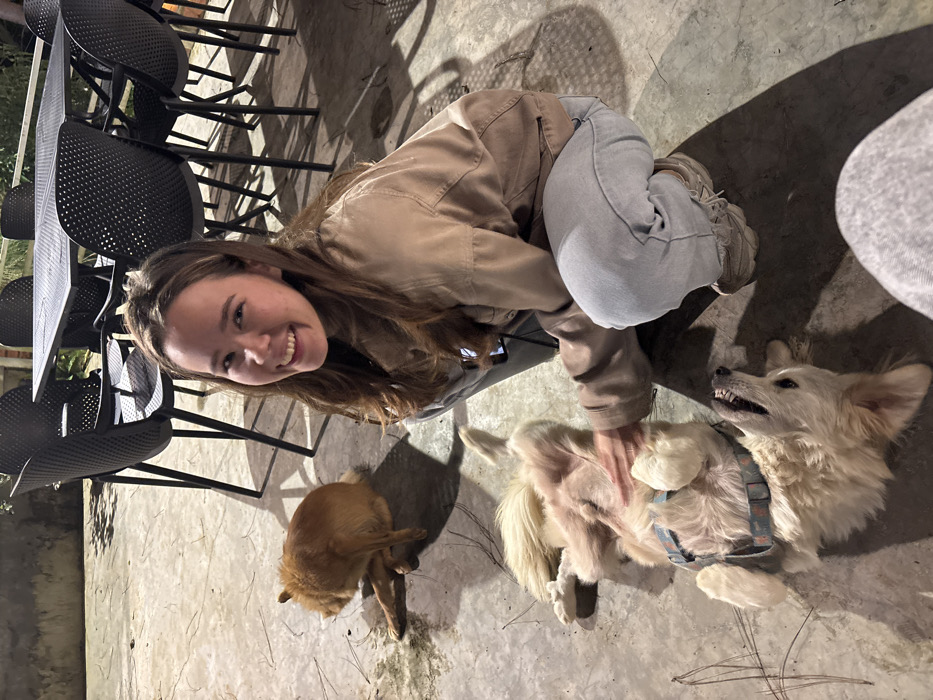 The scene, located in Thành phố Đà Lạt, Vietnam, depicts a young adult female interacting with two dogs on a paved outdoor surface under artificial lighting, likely at night