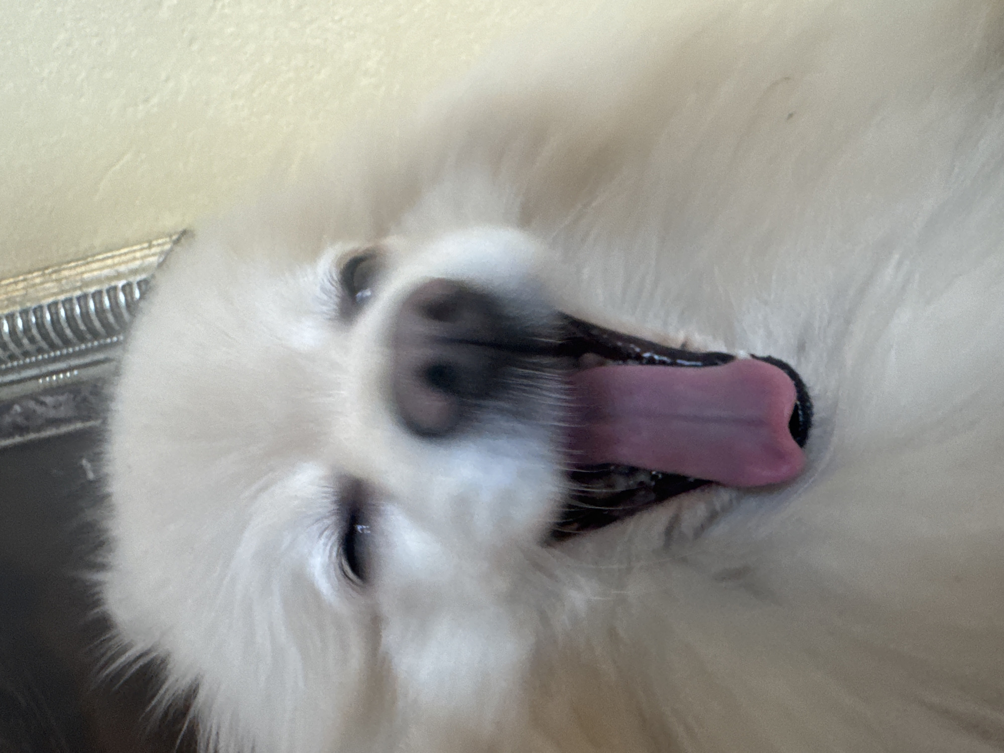 A white-furred dog, consistent with a Pomeranian or similar Spitz breed, is depicted in a close-up, front-facing view, captured mid-yawn. The dog's mouth is wide open, exposing a prominent pink tongue fully extended, and its eyes are squeezed shut. A black nose is visible at the center. The fur is thick and white, obscuring most of the ears. The background consists of a light-colored, likely cream or beige, wall or surface to the right and upper right, and a darker, indistinct area to the upper left. A metallic, ribbed object, possibly a frame or decorative element, is partially visible in the upper-central left background. The scene occurs indoors in the city of Saint Petersburg, Russia.