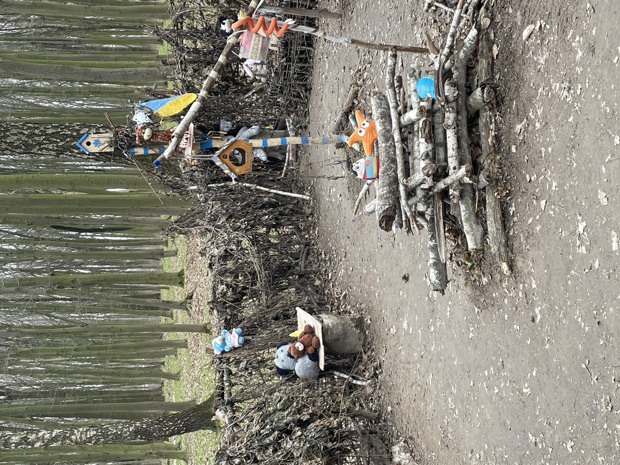 The image depicts a forest scene, possibly located in or near Vinnytsia, Ukraine, based on the style of decorations and objects found in the photo. Foreground: A dirt path runs along the right side of the frame. A structure made of stacked branches is positioned near the path, with stuffed animals attached to it. A container filled with more stuffed animals sits in front of a woven brush fence. Midground: A series of vertical trees line the left side of the image. The trees recede into the distance, creating a sense of depth. In the center, there's an elaborately decorated post adorned with birdhouses, signs, and various objects, potentially crafted by children. Background: The forest continues into the background with a dense collection of trees.