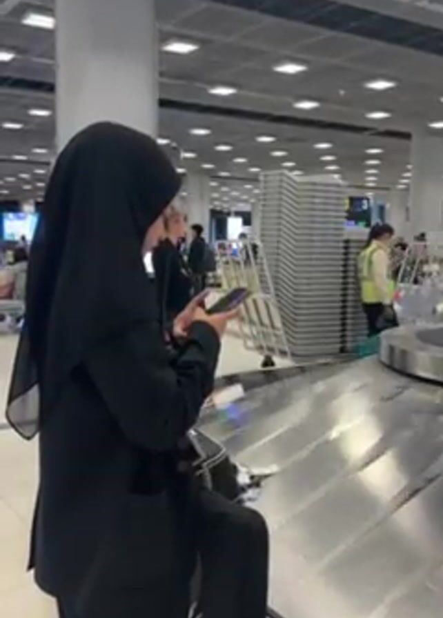 A woman dressed in black, including a black hijab, is standing at a baggage carousel in an airport. She is looking at a mobile phone in her hands. Luggage is circulating on the carousel. In the background, other people wait for their luggage, and a staff member in a yellow vest stands near a stack of baggage trays. The airport has a modern, well-lit interior.