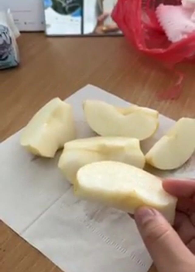 A first-person view shows a hand holding a peeled apple slice. Several similar slices are arranged on a square white napkin on a light brown surface. Behind this is a red plastic shopping bag, also containing white packing foam. Reflected in a mirror in the background is a person wearing glasses and a head covering, holding a phone. A calendar and a box of tissues are also visible in the background.