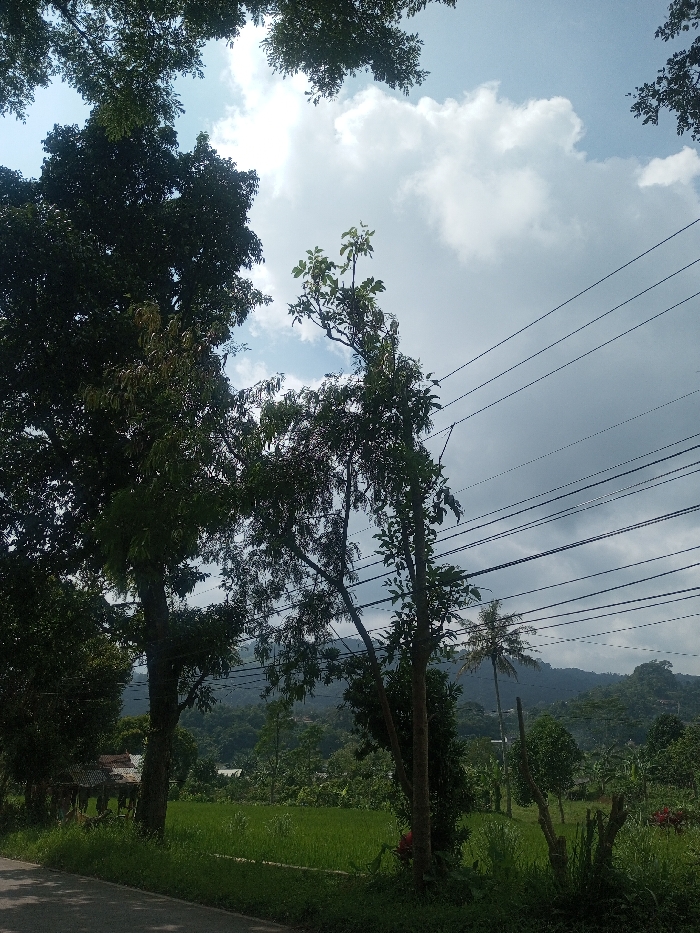 The image presents a rural landscape in the city of Unknown, Vietnam, under a partly cloudy sky. In the foreground, a dark asphalt road runs horizontally across the bottom. Prominent green-leafed trees with visible trunks occupy the left and central-left portions of the frame. Beyond these trees, a vibrant green cultivated field, consistent with a rice paddy, is visible. A small, rustic shelter with a light-colored roof is partially visible behind trees on the far left. Numerous black utility lines stretch horizontally across the middle and upper right sections of the image. A distinct palm tree stands in the mid-right, with smaller trees and shrubs scattered throughout the mid-ground. The background features rolling, forested hills under a sky with scattered white cumulus clouds. No individuals are present.