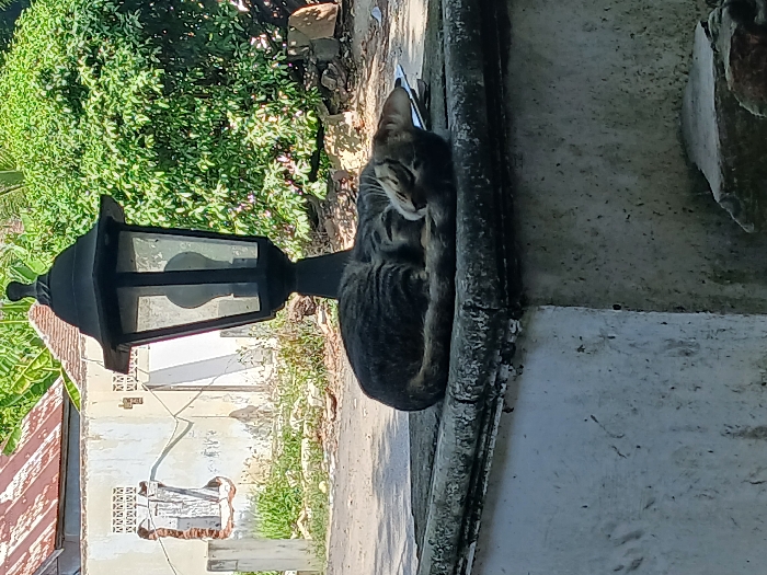 - "A curled tabby cat rests next to a black lamppost" by FM-VsOY53, licensed under CC BY 4.0