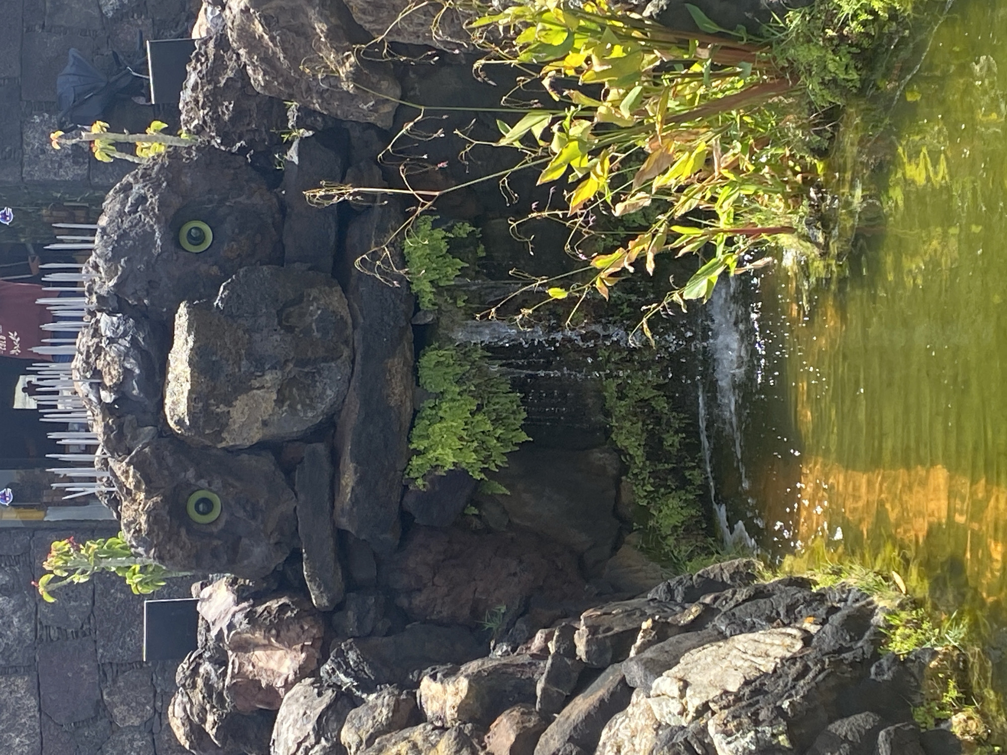 rock formation in the form of a face with green eyes beside a small pool of water. The rock face is constructed from dark grey and brown rocks, and water appears to be flowing from within the structure into the pool. Some greenery, including plants and moss, grows around the rock face and the edge of the pool. The pool itself is greenish-yellow. The scene seems to be set outdoors, likely within a garden or park in Teguise, Spain.