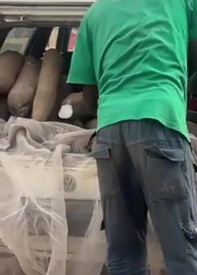 A man is loading large, oblong, root-like vegetables into the trunk of a white Volkswagen. The trunk is nearly full, with the vegetables appearing to be covered by a loose, white netting. The man is wearing a green t-shirt, blue jeans, a black cap, and brown sandals. The car appears to be parked on a dirt or sandy surface in an outdoor environment. Buildings and other people are visible in the background, suggesting a somewhat urban or populated area. The video seems to have been taken in daylight conditions.