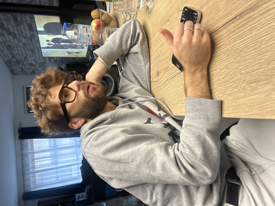 - "An interior scene captured from a slight upward angle shows a young adult male seated at a light-colored wooden table, likely within a private residence in Saint-Médard-en-Forez, France" by FM-bcuvC3, licensed under CC BY 4.0