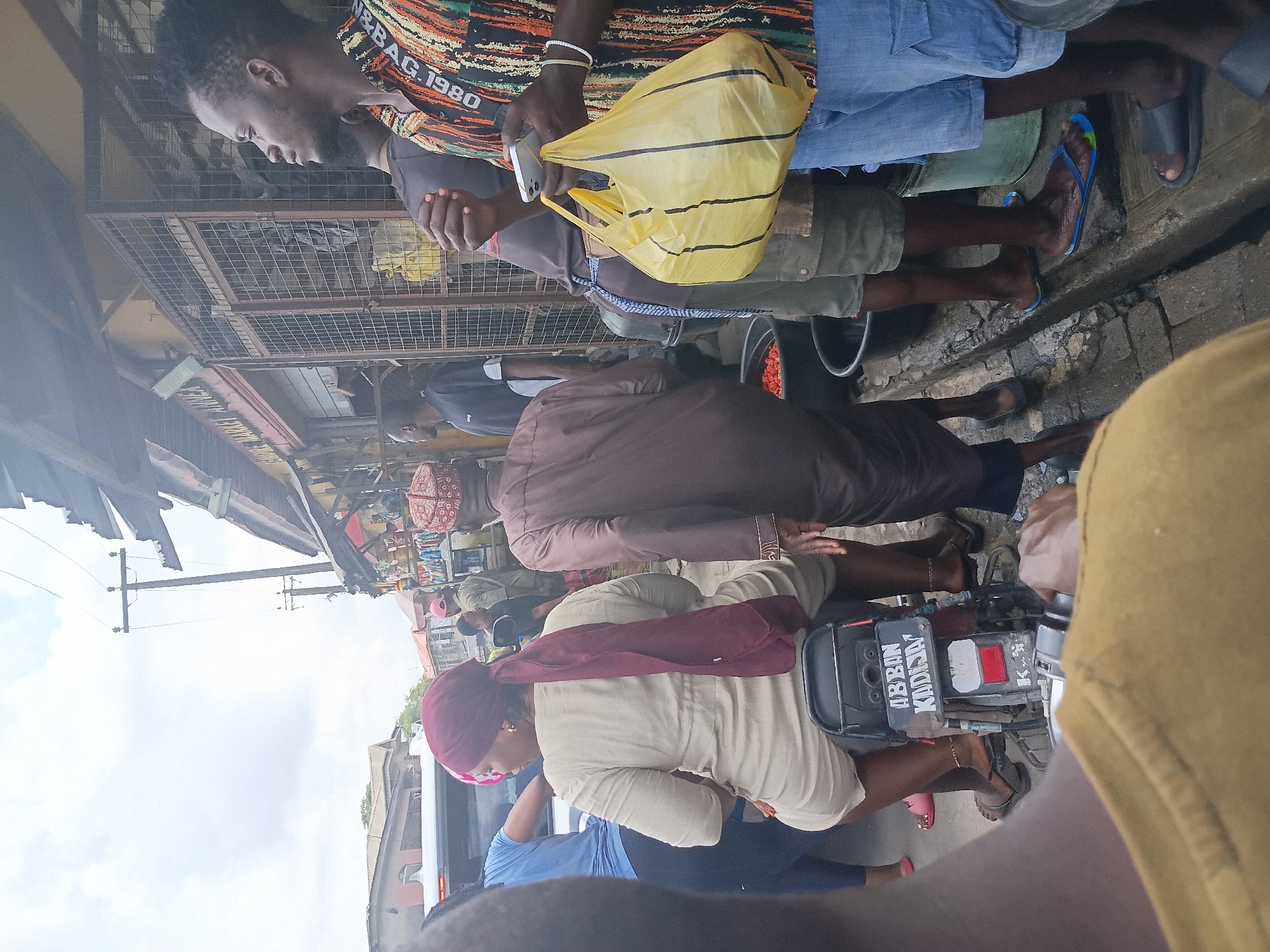 This image depicts a bustling street scene in a market area within Lekki, Nigeria, likely the George Market Annex. The foreground features the shoulder and right arm of an individual in a yellow shirt, with their hands positioned as if operating a motorcycle. In the mid-ground, a woman wearing a light-colored dress and a maroon headscarf is seated on a dark motorcycle, which bears the license plate "ABBAN KADIJA". She wears gold earrings. To her right, a man in a brown traditional tunic and matching cap walks past the motorcycle, facing away from the viewer. To the right of him, another man stands facing right, wearing a multi-colored patterned shirt, blue shorts, and flip-flops. He holds a white smartphone in his left hand and a yellow plastic bag with vertical black stripes in his right hand; a white bracelet is visible on his left wrist. Behind these individuals, several dark buckets and basins filled with red produce, likely tomatoes or peppers, are visible on the ground beside a raised concrete edge. Further background shows market stalls with metal grates and corrugated roofing, with a sign partially reading "GEORGE MARKET ANNEX". Overhead power lines and wooden utility poles are visible against an overcast sky. Additional people are present throughout the background, engaged in various market activities, including one man in a dark t-shirt and khaki shorts with a striped cloth tied around his waist, standing near the stalls. A white vehicle is partially visible behind the motorcycle. The ground appears to be a mix of paved and unpaved surfaces, with some puddling.