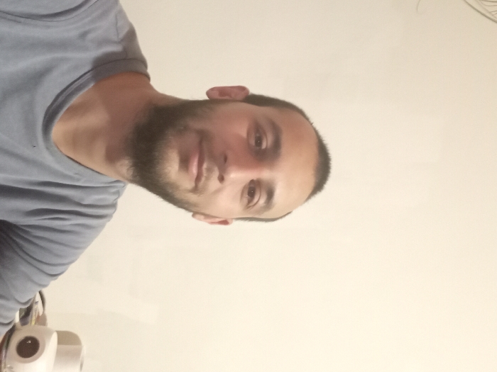 An adult male is depicted in a close-up indoor portrait. He has short dark hair and a full, dark beard. He is wearing a light blue or grey short-sleeved t-shirt and is looking directly at the camera with a neutral to slightly smiling expression. The background consists of a plain, light-colored wall. In the lower right corner, partially visible on a surface, are a white electronic device with a circular dark lens or sensor, and a white cylindrical object, possibly a paper roll. The scene is located in Provadia, Bulgaria.