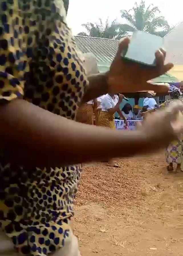 group of women dancing outdoors, likely at an event or celebration. The dancers are dressed in colorful traditional attire, with matching headscarves and patterned skirts. They are moving in a synchronized manner, accompanied by music and singing, possibly from a nearby drum. A person in a blue and yellow spotted shirt holds a smartphone, possibly recording the performance. In the background, there is a tent with a sign that reads "ST ANTHONY OF DIEZEIKE, AMANO,". The ground is covered in reddish-brown earth and there are some buildings and palm trees in the distance.