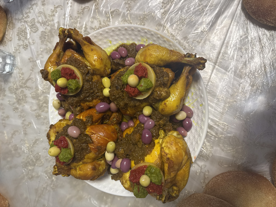 A plate of roasted chicken quarters is shown, each adorned with a dollop of dark green sauce and a decorative slice featuring red, green, and white spheres. Purple and yellow olives are scattered around the chicken pieces. The presentation is on a white plate with a floral design around the rim. The setting includes a tablecloth with a raised floral pattern and a few round breads or buns are seen around the plate.