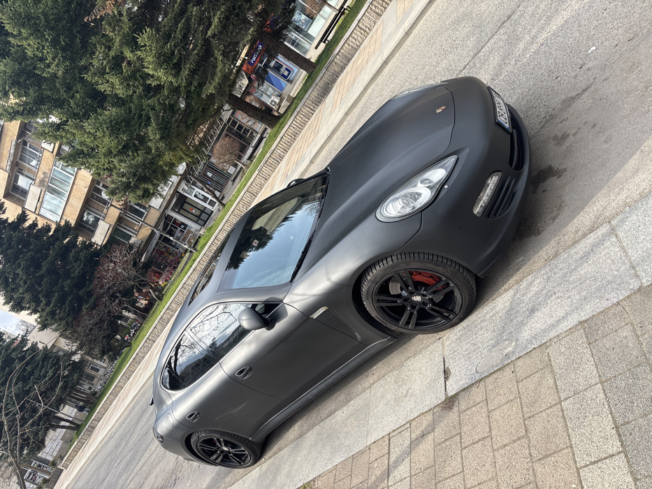 A matte black Porsche Panamera (970 generation) is parked at an angle on the right side of an asphalt road in Botevgrad, Bulgaria