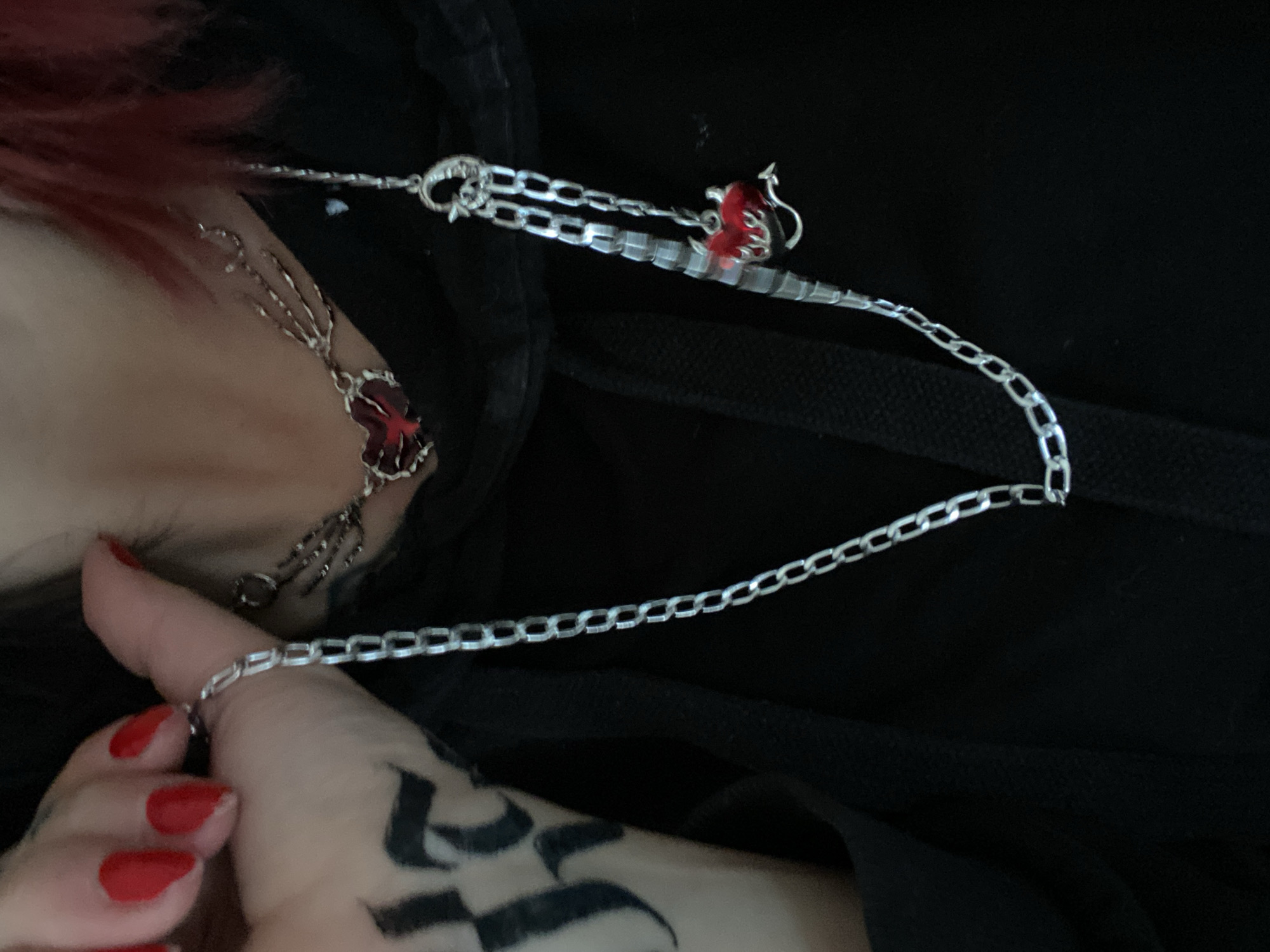 A close-up image depicts a person from the neck down to the upper chest, with a partial view of their left hand and forearm. The visible hand has neatly painted red fingernails and holds a segment of a silver-colored chain in a relaxed grip. A dark, ornate, Gothic-style tattoo is visible on the inner forearm/wrist area. The subject wears two distinct silver-colored necklaces. The upper necklace features a dark red heart-shaped central pendant, flanked by intricate skeletal-like or thorny adornments, resting on the skin below the neck. The lower necklace is a multi-strand piece, consisting of a textured, possibly coiled or ribbed silver chain and a finer link chain, from which a small red charm shaped like a heart with horns and a tail (a "devil heart") is suspended via a lobster clasp. Partially visible red hair frames the right side of the neck. The subject wears a plain black hooded garment, likely a hoodie. The background is uniformly dark and featureless, offering no specific environmental details. The city of Kunje, Montenegro, is not visually verifiable within the image.