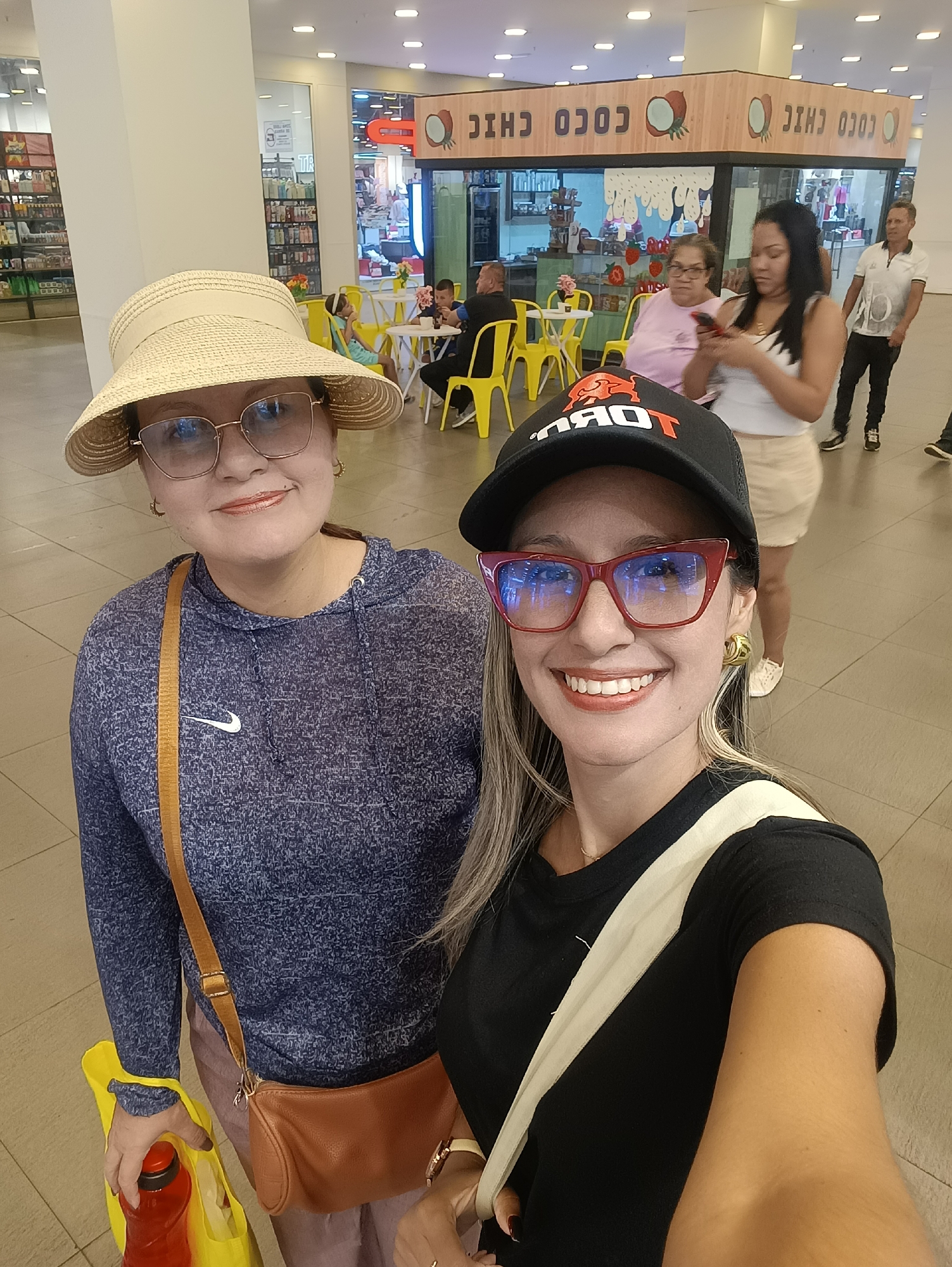 Two women pose for a selfie inside a brightly lit commercial building, potentially a shopping mall. The woman in the foreground wears a black baseball cap with a logo, a black t-shirt, and red framed glasses. She has shoulder-length blonde highlighted hair and wears gold earrings. Beside her is a woman wearing a tan sun hat, glasses, and a navy blue Nike sweatshirt. She has a tan purse slung across her body and carries a yellow bag with a red bottle inside. In the background, patrons sit at tables and chairs in front of a business labeled "COCO CHIC" in reverse writing. Additional people are visible in the background, including a woman looking at a phone and a man wearing a white polo shirt. The floor is tiled and the lighting appears to come from ceiling-mounted fixtures. Given the provided information, the location is presumed to be in Santa Teresa, Venezuela, but specific details confirming this are not present in the image.