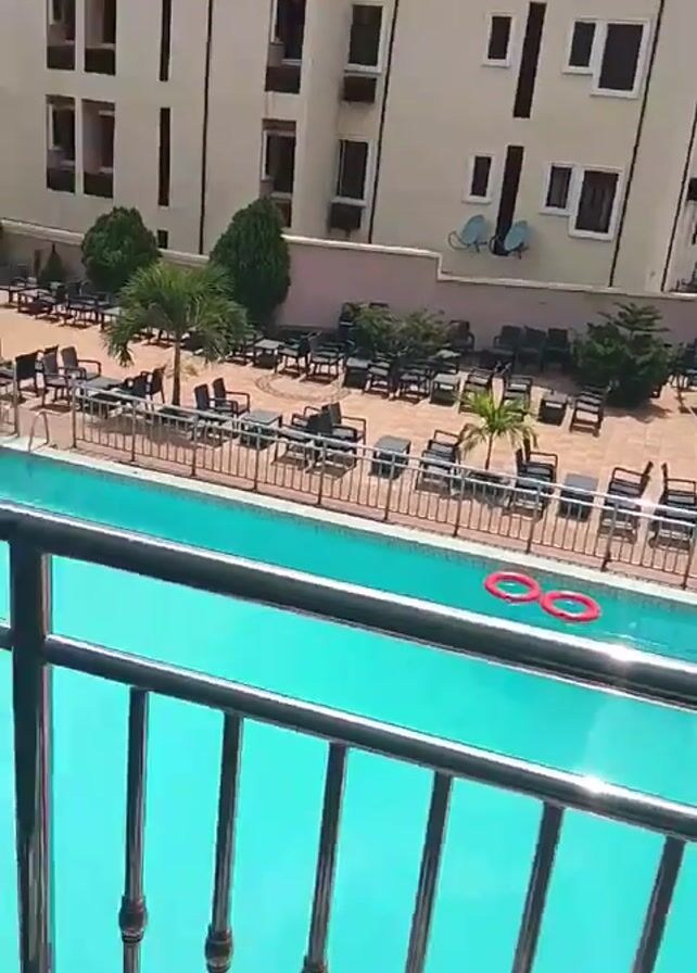 The camera, positioned behind a metal railing, offers a view of a rectangular swimming pool filled with bright blue water. Two red life preservers float in the water. The pool is surrounded by a tiled patio dotted with black tables and chairs, as well as small palm trees and bushes. Behind the patio is a tall, light-colored building with multiple windows and several air conditioning units mounted on its exterior walls. The scene appears to be taken outdoors on a sunny day.